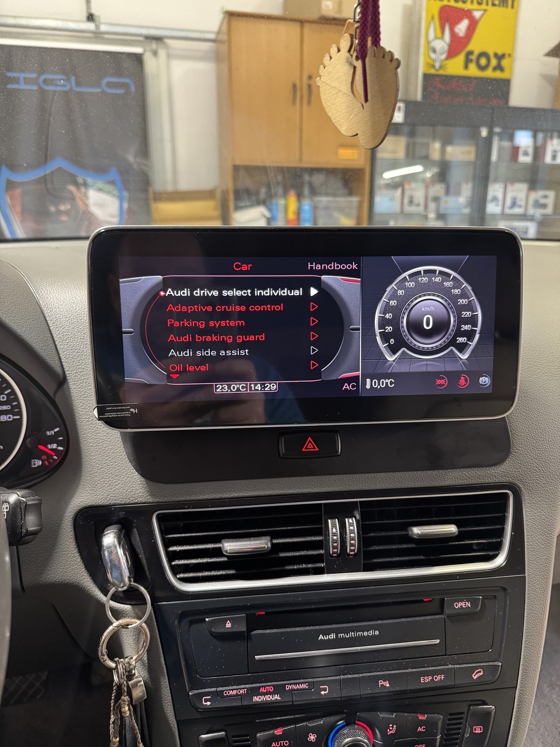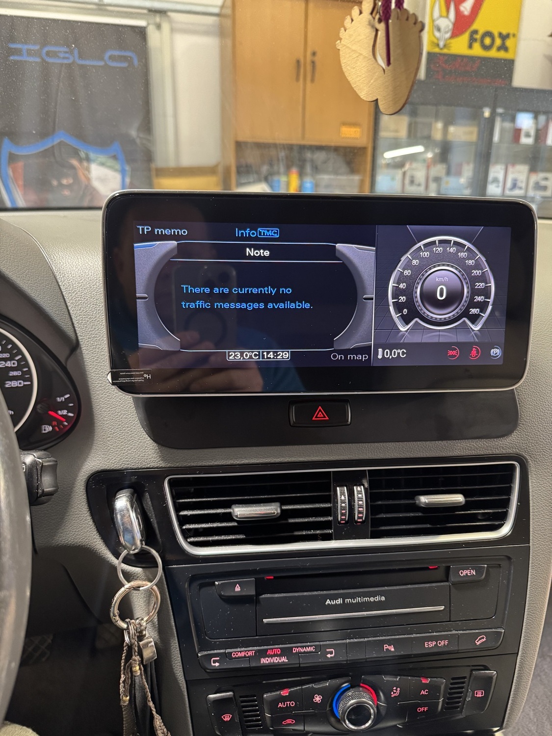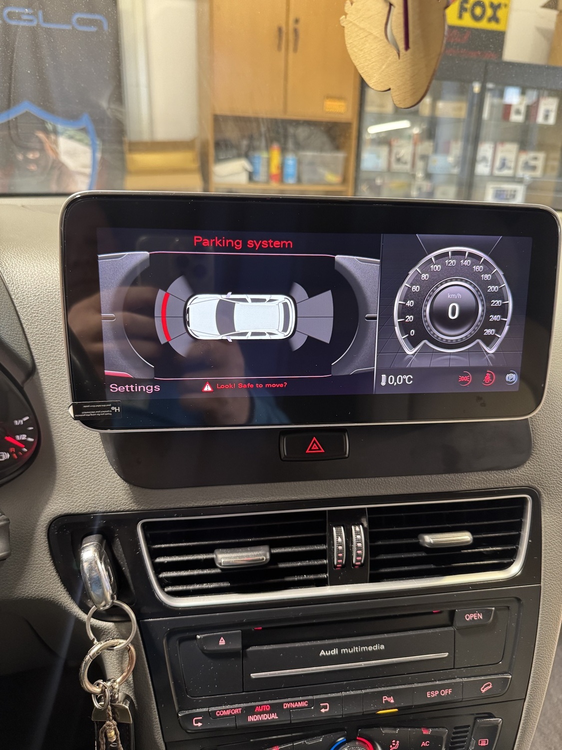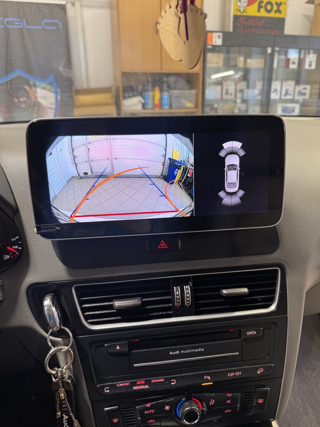 Sterowanie komputerem oraz widok radia i funkcji komputera pozostaje bez zmian, Nawigacja do Audi Q5 na ekranie głównym pokazuje informacje z klimatronika i parktronika po podłączeniu kamery cofania pokazuje linie skrętne.