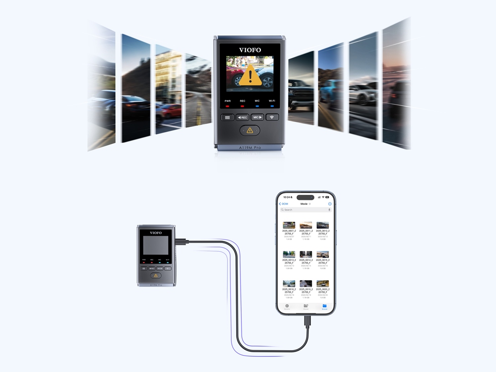 Podłącz urządzenie bezpośrednio do telefonu za pomocą kabla USB 2.0 typu C do typu C, aby bezproblemowo i szybko przesyłać pliki (do 20 MB/s na iPhonie 16). To najprostszy sposób na pobieranie nagrań i aktualizację oprogramowania kamery samochodowej.