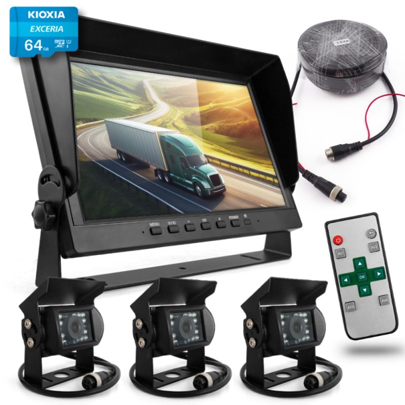 Start / Sklep / Kamery Samochody Ciężarowe, Bus, Maszyny Rolnicze Budowlane / Zestaw Cofania Monitor 10″ Rejestrator FHD 1080p 3 x Kamera AHD Kabel 15m