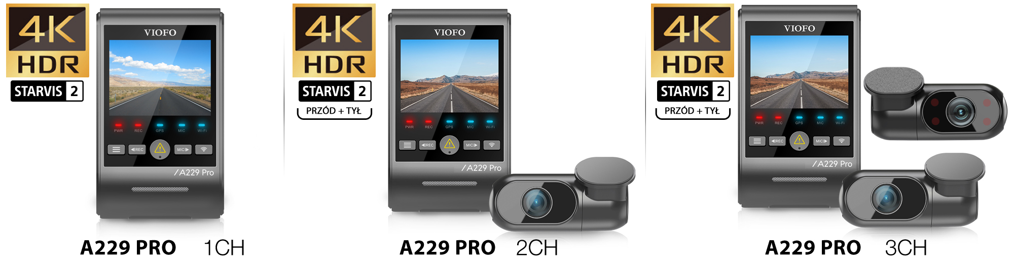 Przełomowa jakość nagrywania dzięki zastosowaniu nowego sensora SONY STARVIS2– pierwsza kamera na rynku wykorzystująca aż dwa przetworniki obrazu STARVIS2 pozwalające nagrywać jakość 4K HDR z głównej kamery (przód) oraz 2K HDR z tylnej!